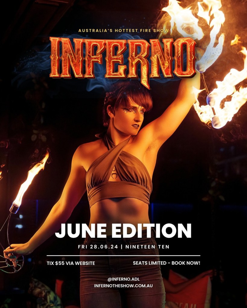 Showcasing a scintillating lineup of insanely talented fire performers, burlesque artists and cabaret acts from Adelaide and beyond, Inferno: June Edition is a piking hot smokeshow that gets adrenaline pumping, hearts thumping and sets the night ablaze. Held at Adelaide’s premier rooftop venue Nineteen Ten, this edition highlights twelve unique talents who set the stage ablaze with their mesmerising mastery of fire manipulation. The venue’s intimate setting accentuates the raw energy of each act, creating an immersive experience that fuses adrenaline with artistry, setting the tone for a truly unforgettable evening.
