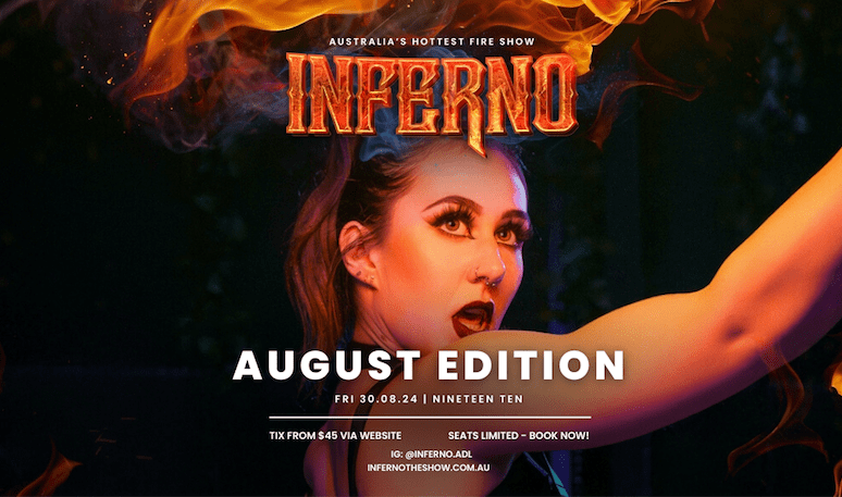 As winter’s chill fades into memory, Inferno: August Edition blazes a fiery farewell to the cold with an electrifying showcase of Australia’s premier fire performers, burlesque stars and cabaret acts. Held on Adelaide’s ultimate rooftop venue Nineteen Ten, August’s edition of Inferno transforms the rooftop into a searing spectacle of heat and artistry. With its dazzling blend of scorching talent and sultry entertainment, Inferno once again proves why it’s the hottest ticket in town.