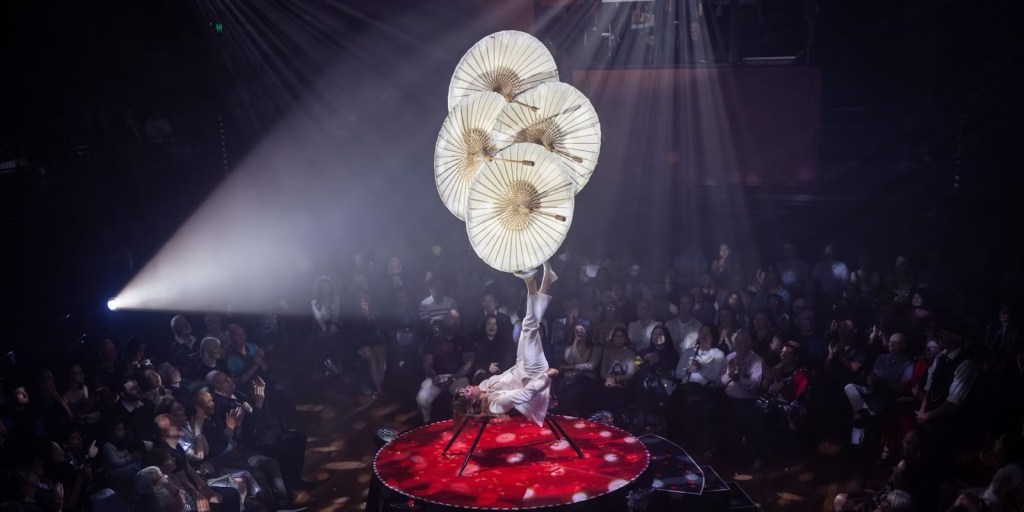 The evening opens with a baptism – in bathwater. Aerialist Tuedon Ariri launches herself skyward from La Clique’s iconic tub, paying homage to the original ‘Bath Boy’ while making the act completely and uniquely her own. With effortless elegance and immense core strength, she twists through the air like a water nymph with an Olympic gymnast’s credentials. Her hair-whip splash zone sends front-row patrons ducking behind plastic sheeting, making the experience all the more immersive. It’s mesmerising, theatrical, and undeniably fierce. Tuedon makes defying gravity look like child’s play.